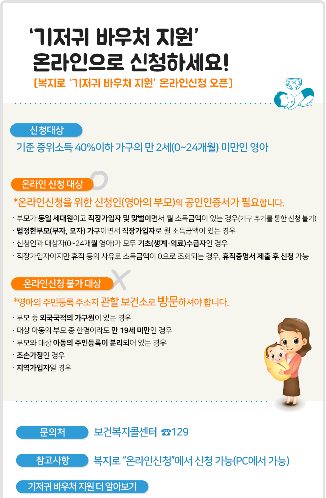 | 지원 대상 | 기준 중위소득 80% 이하, 만 2세 미만 영아 |