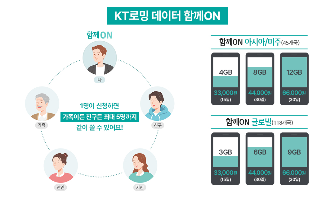 KT 해외 로밍의 '함께 쓰는 로밍 글로벌'은 최대 5인까지 데이터를 공유할 수 있는 혁신적인 요금제입니다. 2025년에는 더욱 넓어진 서비스 국가와 함께 데이터 제공량도 대폭 증가했습니다.